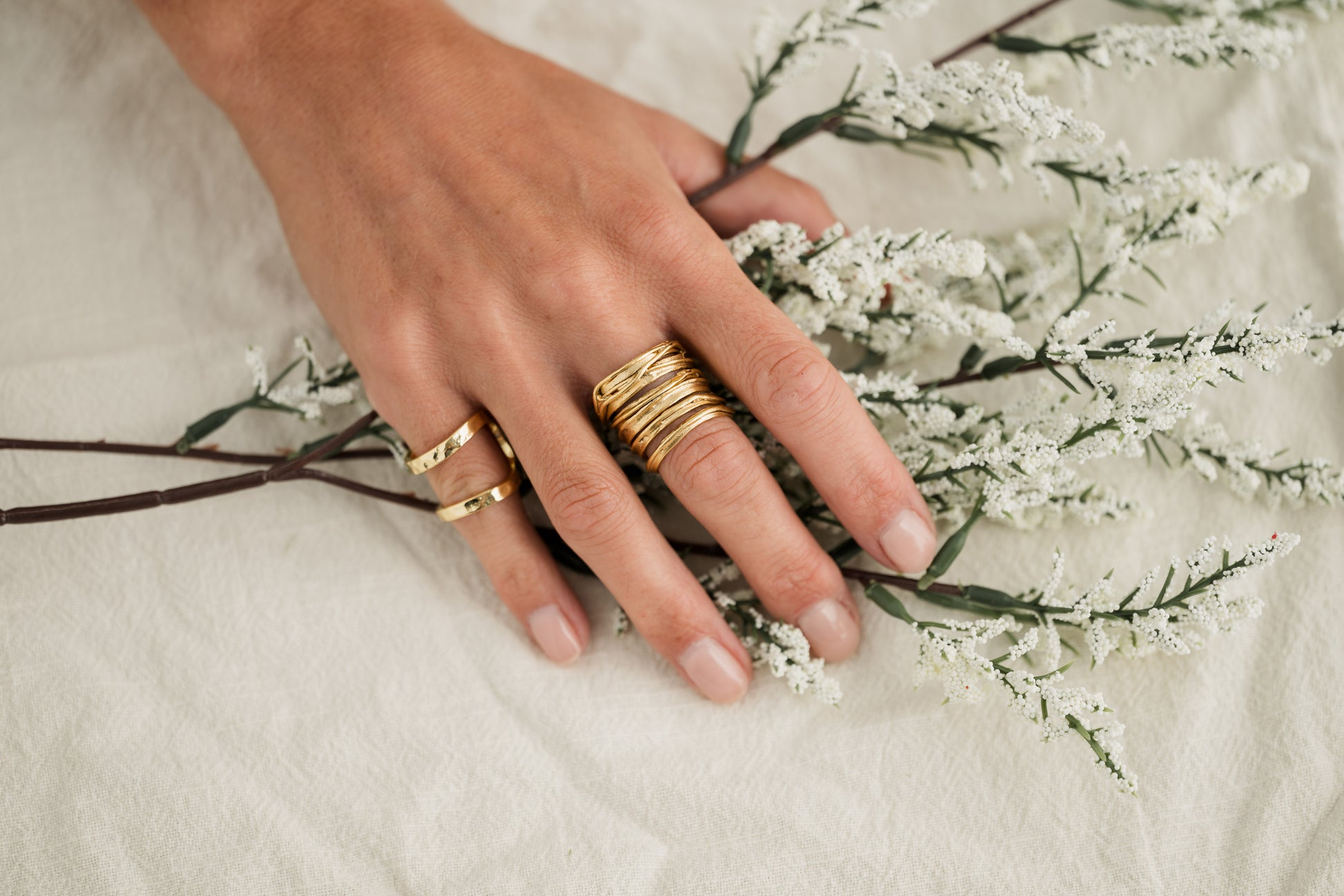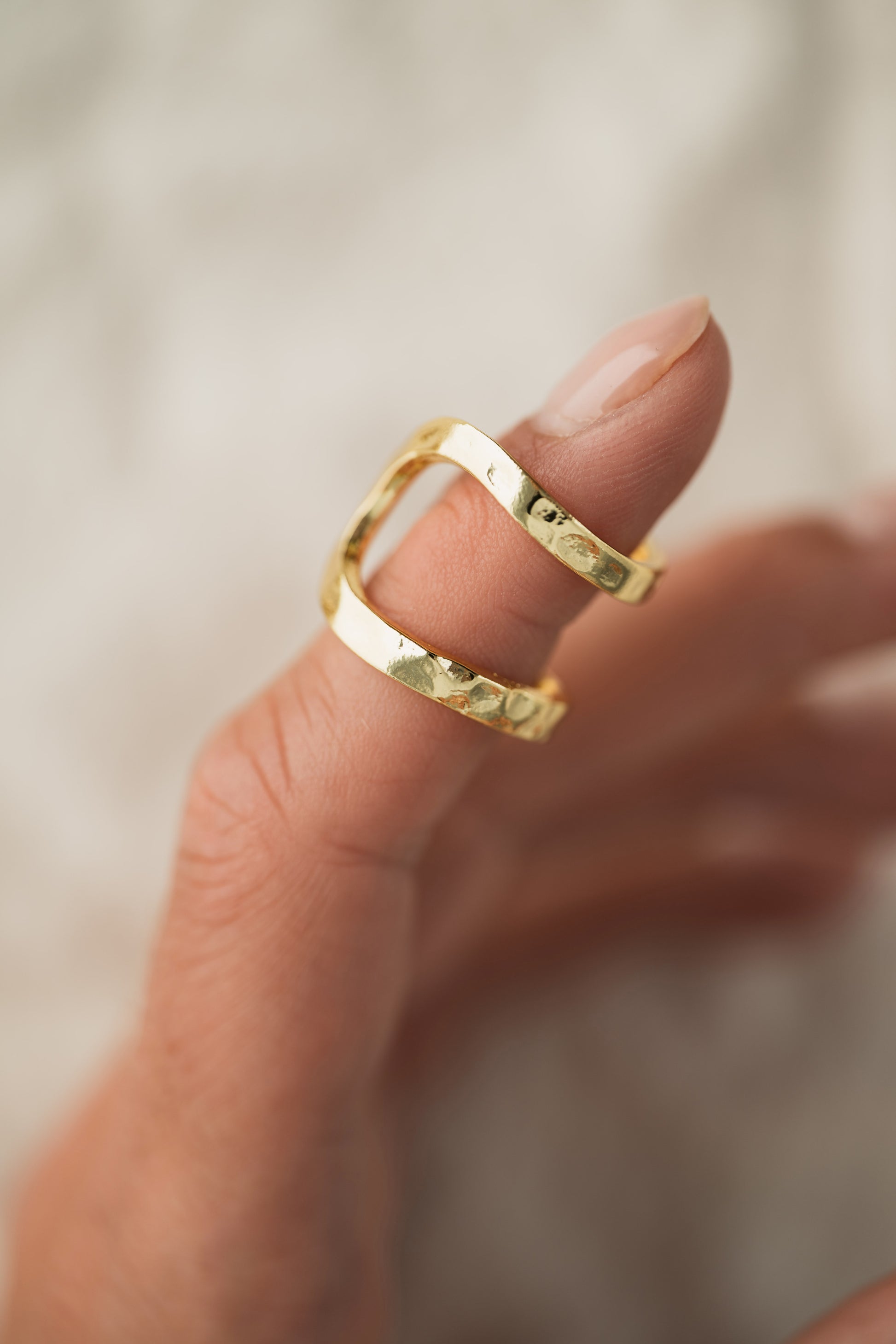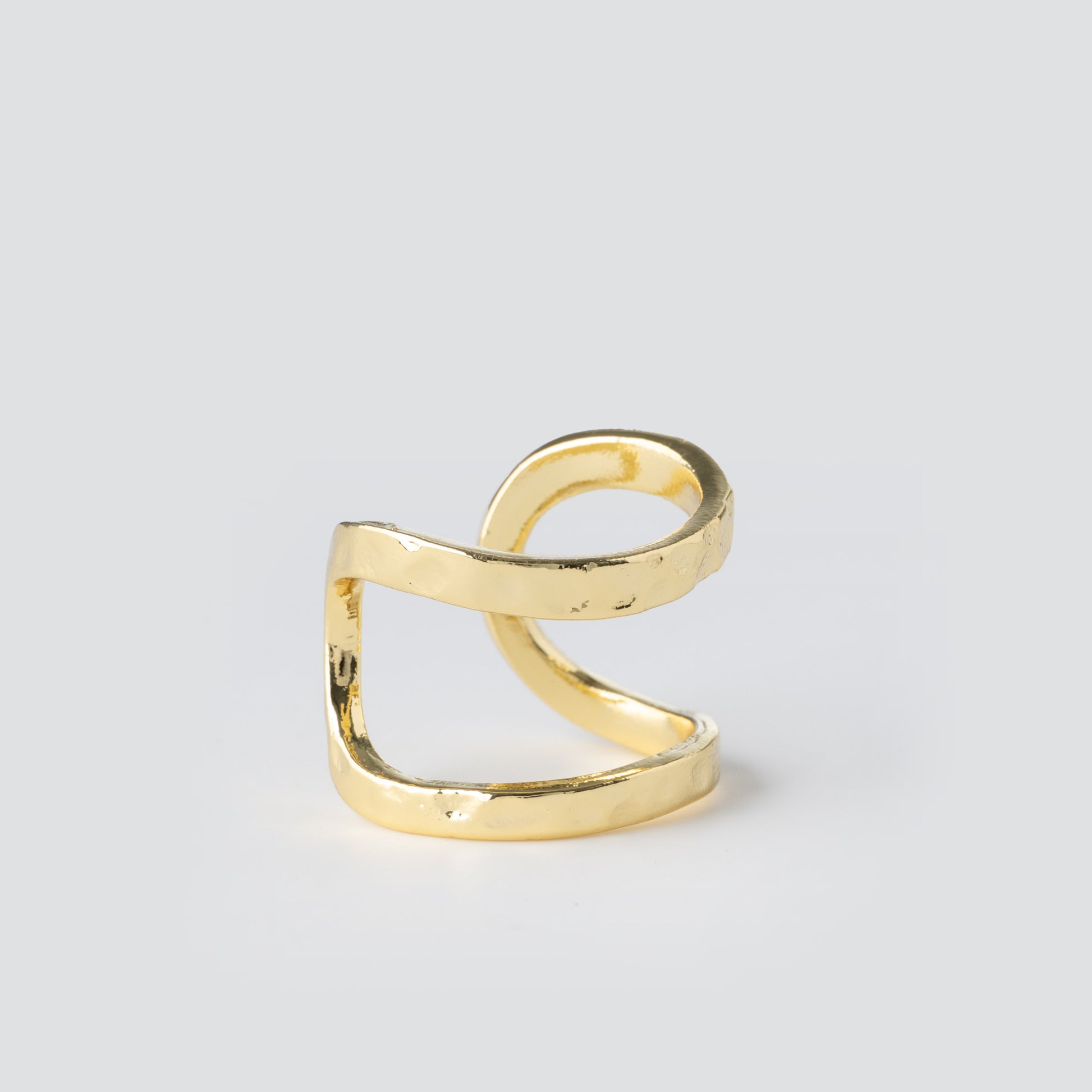 This beautiful ring is designed in an open frame that wraps around the finger, created in a simplistic free-form shape. Hammered finish detailing accents the ring which lends added texture and dimension. Always be known for understated style and elegance.
